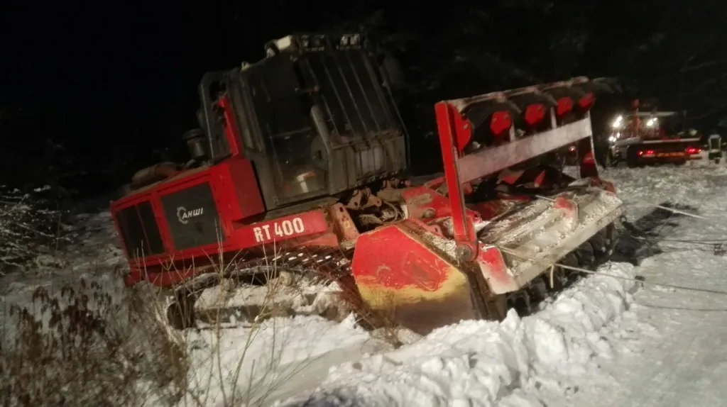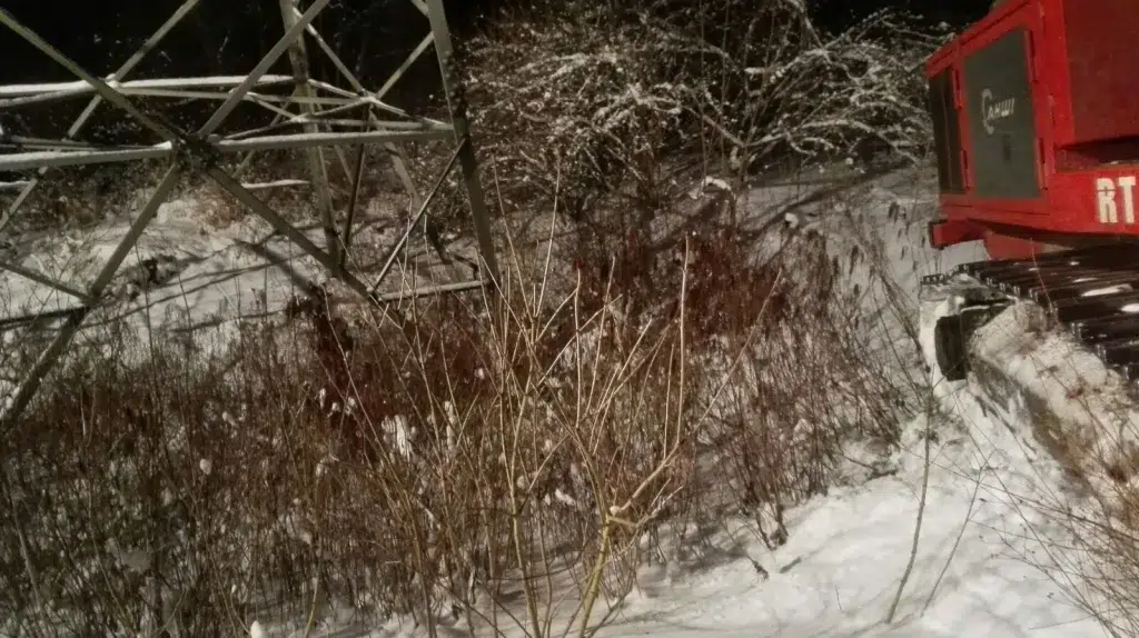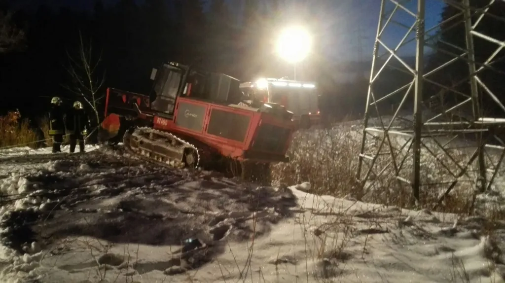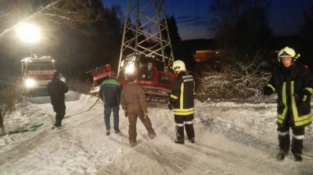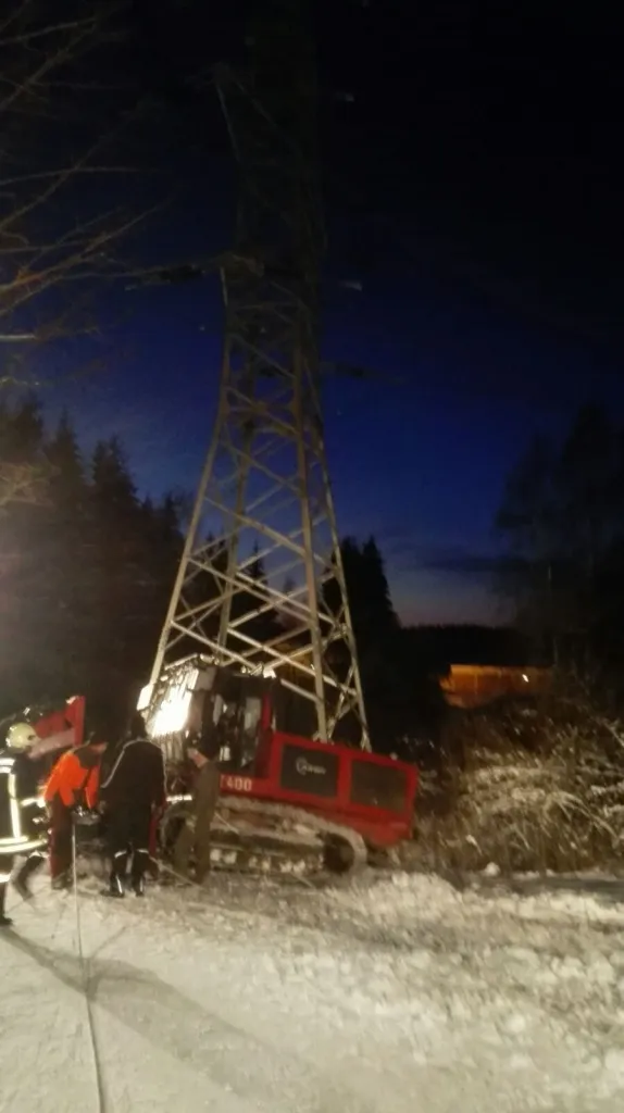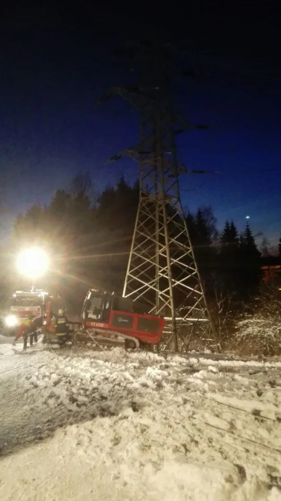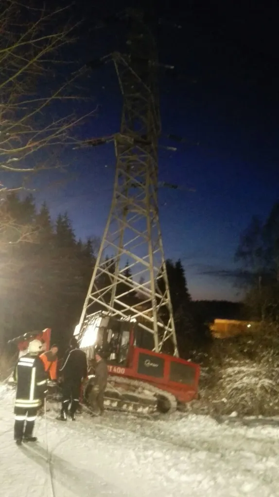 Ein Forstmulcher geriet auf glattem Untergrund ins Rutschen und kam am Rand einer Böschung zum Stillstand. Es bestand die Gefahr, dass er jeden Moment über die Böschung abstürzen und dabei auf den nur rund 3 Meter entfernt stehenden Strommast treffen könnte.