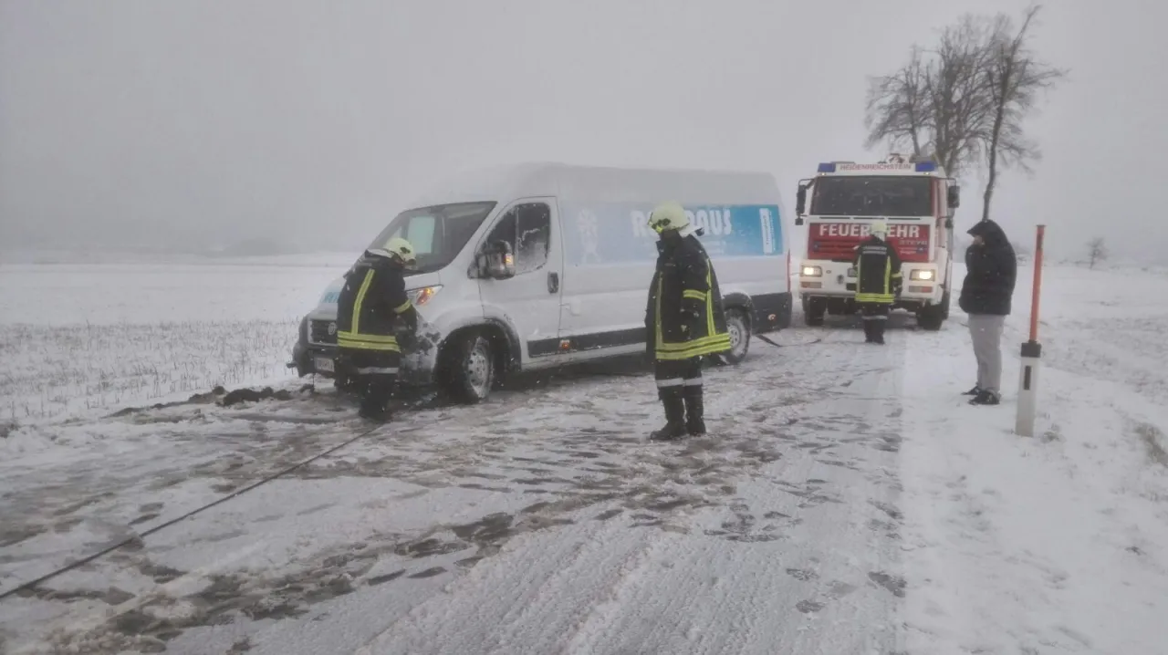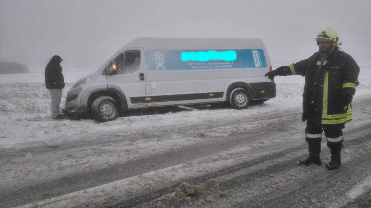 Der Lenker eines Lieferwagens kam auf Grund der schmierigen Straßenverhältnisse ins Rutschen. Das Fahrzeug stieß dabei gegen eine Feldzufahrt und musste von der FF Heidenreichstein aus dem Straßengraben geborgen werden.