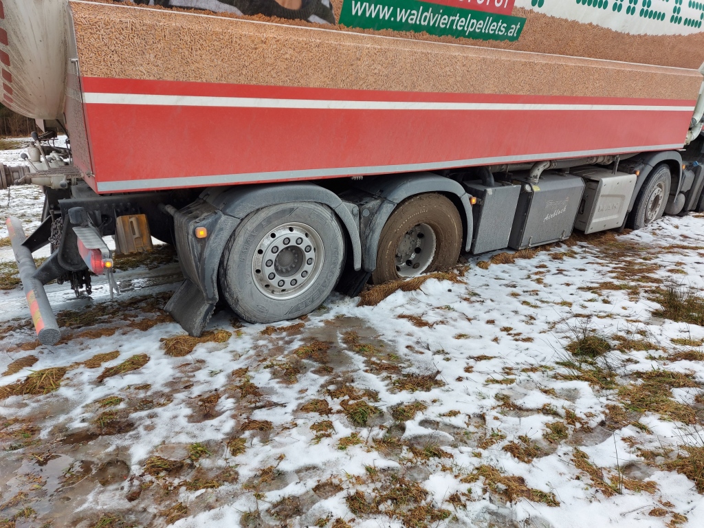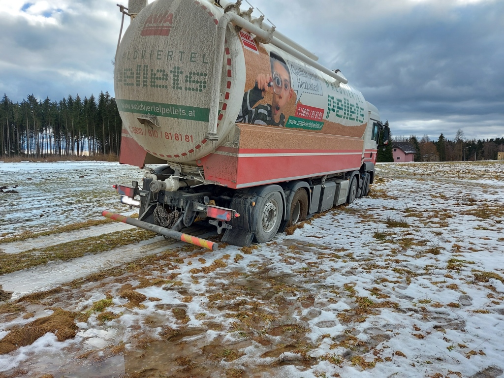 Erst durch den Einsatz einer Seilwinde und einer Umlenkrolle der FF Heidenreichstein führte zum gewünschten Ergebnis. Nach der Bergung konnte der Lenker seine Fahrt fortsetzen und das Haus mit den Pellets beliefern.
