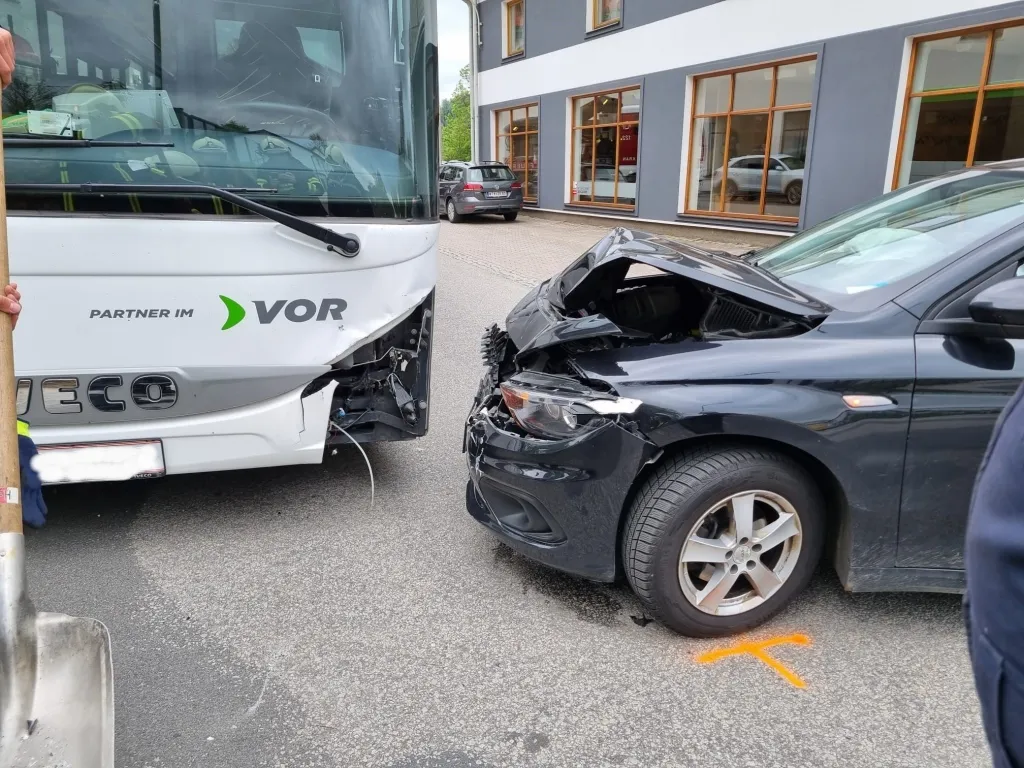 Ein PKW-Lenker kollidierte mit einem entgegenkommenden Autobus. Das fahruntaugliche Auto wurde von der Feuerwehr mittels Krans geborgen. Nach dem Reinigen der Fahrbahn konnte die Straße wieder für den Verkehr freigegeben