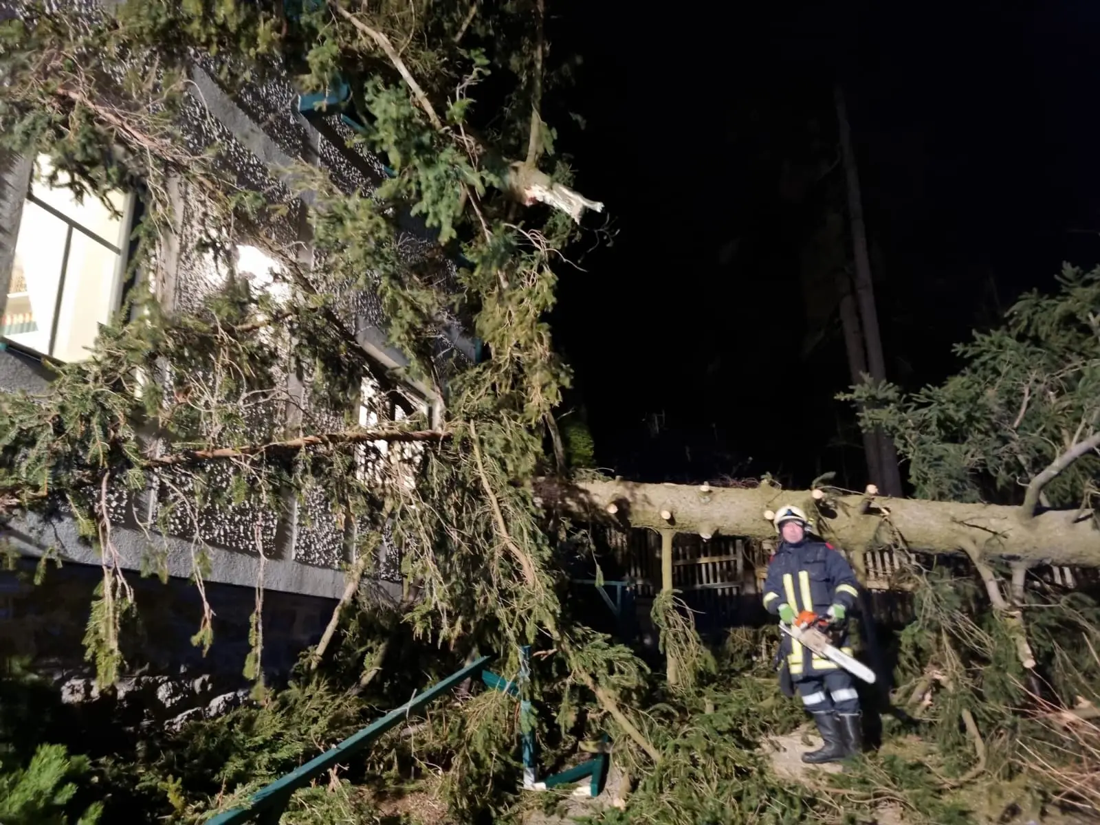 Durch den Sturm wurde ein Baum abgebrochen und er stürzte auf ein Haus. Dabei beschädigte er das Dach schwer und ein Ast drang sogar in ein Schlafzimmer ein. Zirka einen