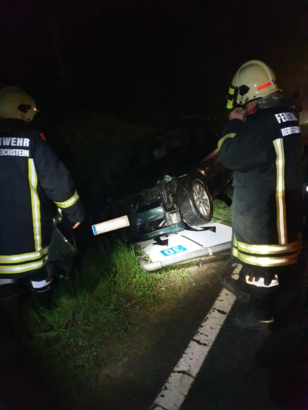 Zwischen Heidenreichstein und Seyfrieds kam ein Lenker mit seinem Fahrzeug in den Graben. Das Auto überschlug sich dabei und blieb am Dach liegen. Da die FF Seyfrieds an diesem Tag