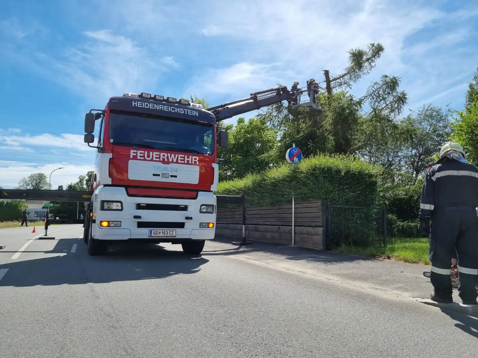 Als Spätfolge des gestrigen Unwetters drohte in der Kautzener Straße ein Baum auf die Fahrbahn zu stürzen. Durch Einsatz des Krans und des Arbeitskorbes konnte der Baum stückweise abgetragen und