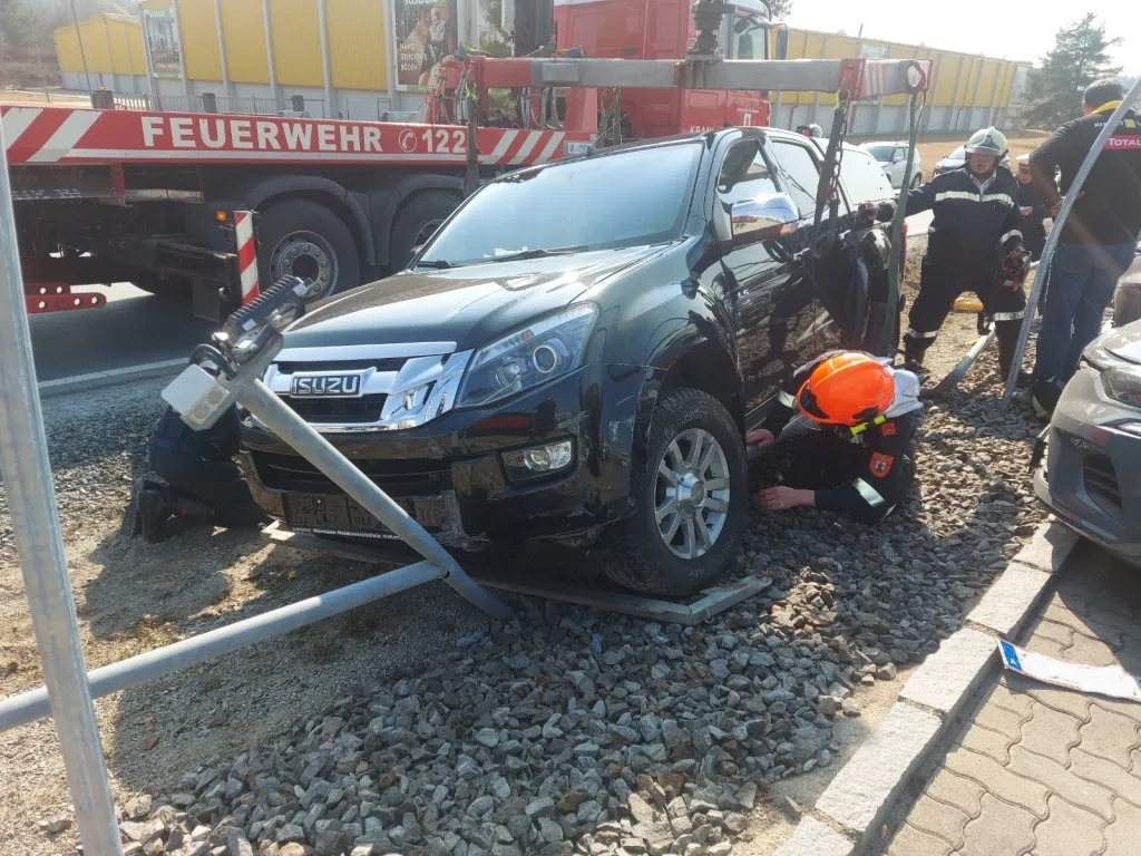Eine PKW-Lenkerin verlor aus unbekannter Ursache die Kontrolle über ihr Fahrzeug. Sie querte daraufhin die Fahrbahn und fuhr Links über eine Gas-Messeinrichtung der EVN und auf die Absperrvorrichtungen des Autohauses