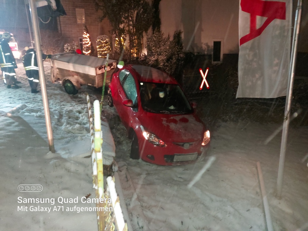 Um 17:46 wurden wir zum nächsten Unfall alarmiert. Ein Mazda-Fahrer kam auf der LB 5 ins Rutschen und krachte bei der evang. Kirche mit seinem Fahrzeug samt Anhänger in den
