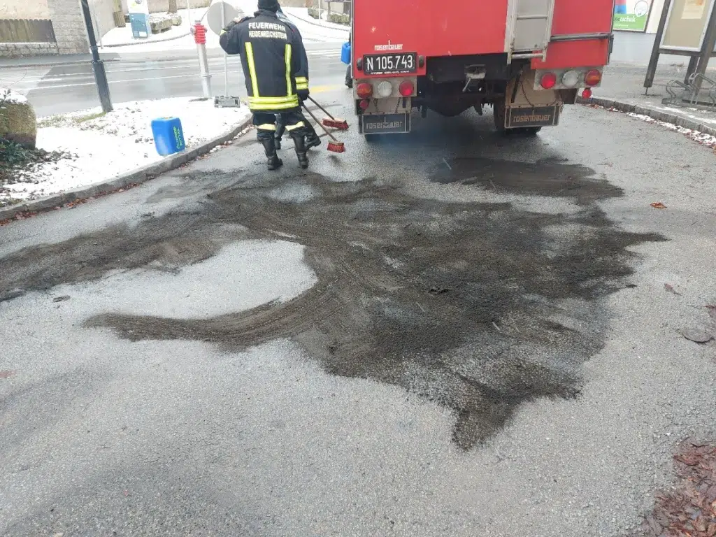 Ein bisher unbekanntes Fahrzeug hat in der Nebenfahrbahn vor der Fa. Gisy Betriebsmittel verloren und eine Ölspur hinterlassen. Die FF Heidenreichstein konnte die Flüssigkeit mittels Ölbindemittel binden. Anschließend wurde die