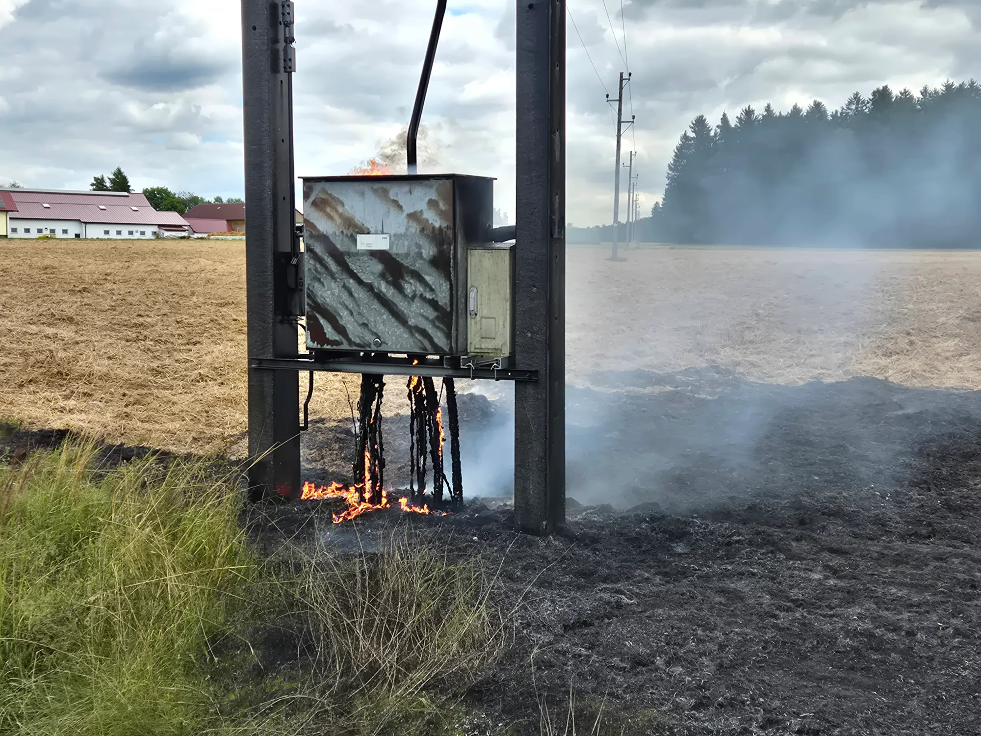 Alarmiert wurden wir zu einem Trafobrand bei der Fa. Talkner. Bei unserem Eintreffen stellte sich heraus, dass es sich nicht um einen Trafo sondern um einen unmittelbar daneben befindlichen Verteilerkasten