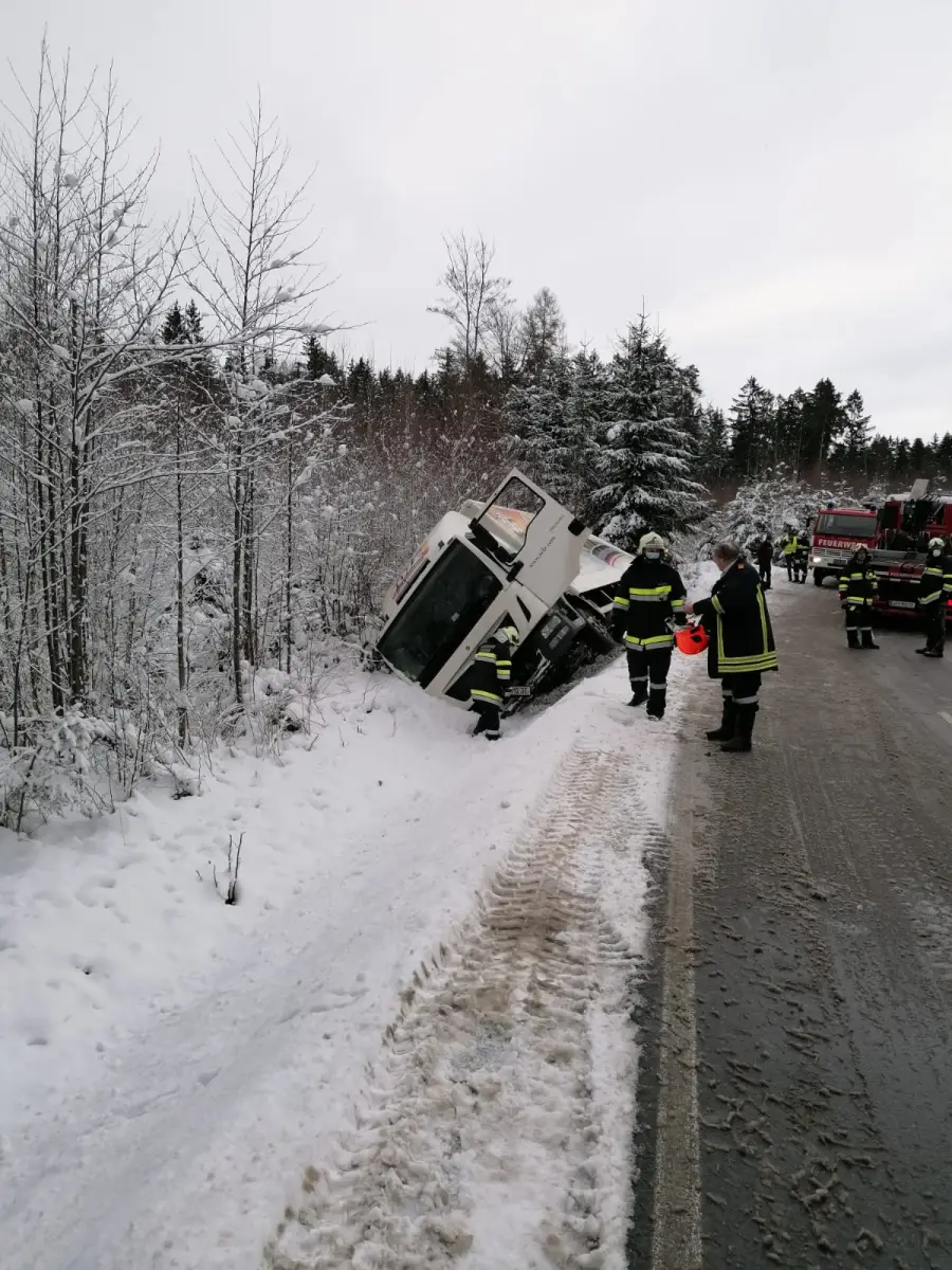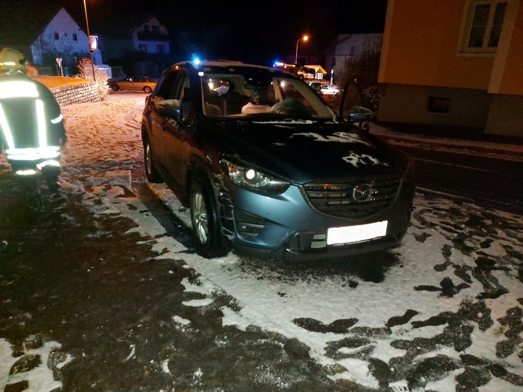 Verkehrsunfall mit einer eingeklemmten Person Eine PKW-Lenkerin verlor auf der schneeglatten Fahrbahn die Herrschaft über ihr Fahrzeug und landete im Graben. Durch die unglückliche Lage des PKW konnte die Frau