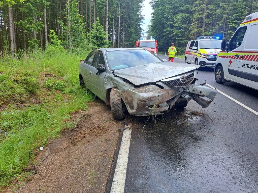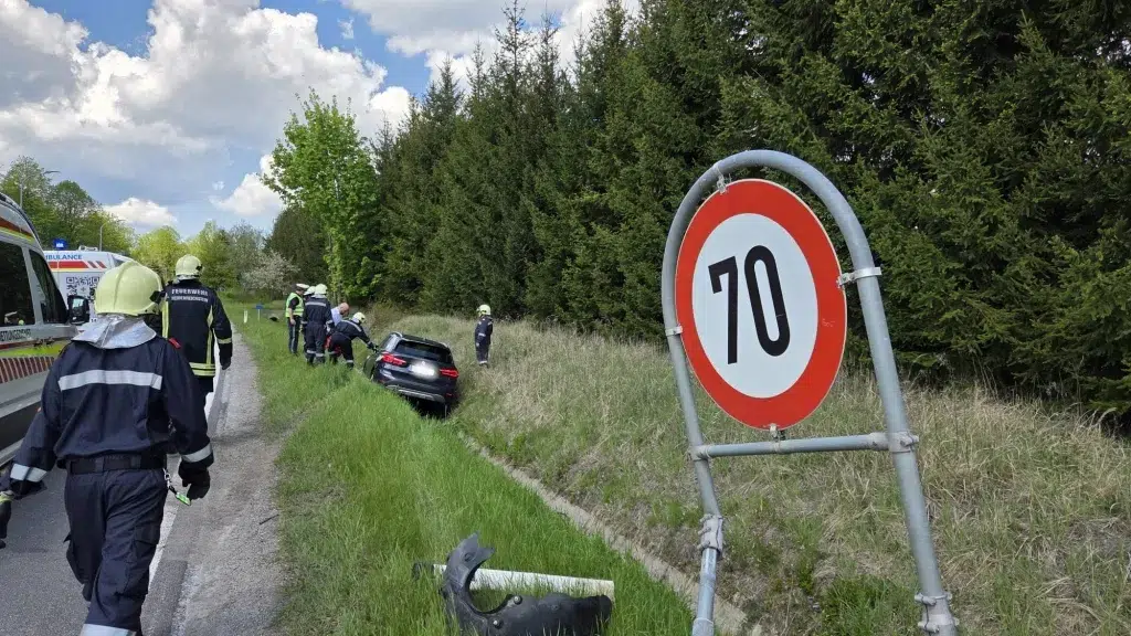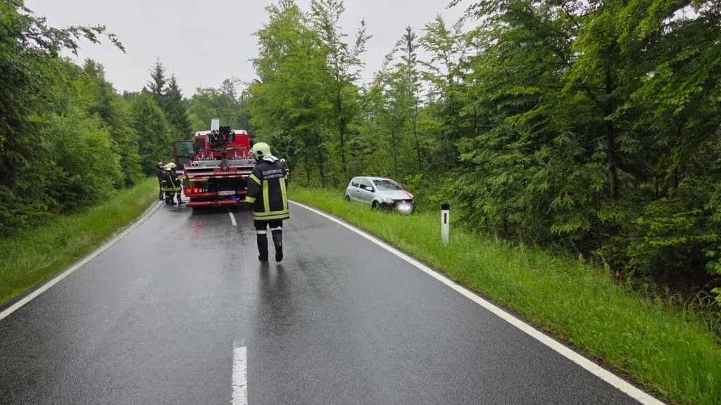 Ein PKW-Lenker kam mit seinem Auto von der Fahrbahn ab und landete im Straßengraben. Der verletzte Insasse wurde vom RK versorgt und ins Spital gebracht. Das beschädigte Fahrzeug wurde mittels