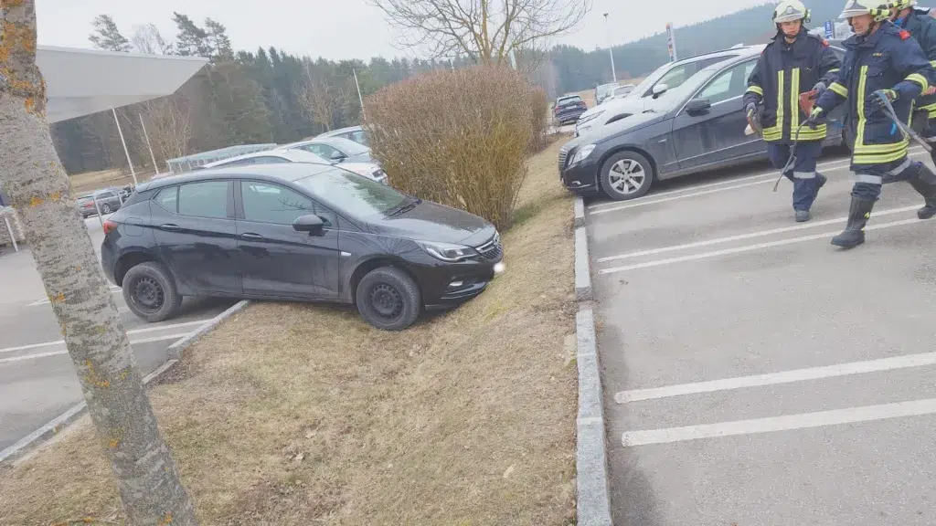 Am Parkplatz der Fa. Hofer überfuhr ein Lenker mit seinem PKW die Parkplatzabgrenzung un blieb auf dieser hängen. Das verunfallte Auto wurde mittels Kran aus dem Graben geborgen und wieder