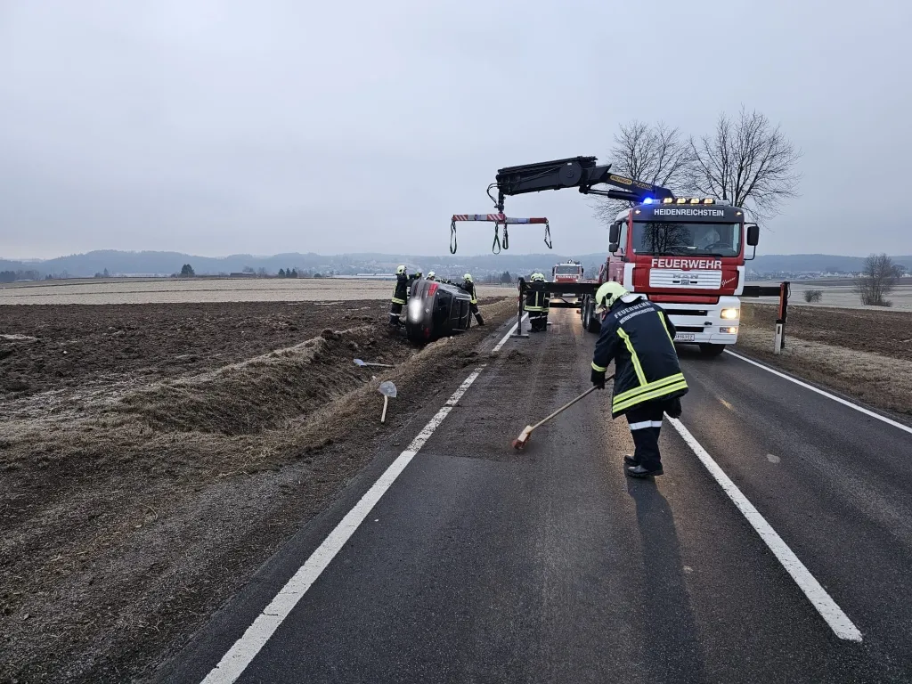 Ein PKW kam im Straßengraben seitlich zum Liegen und musste mittels Kran aus dem Graben geborgen werden. Er wurde anschließend von der Unfallstelle verbracht und die Fahrban wurde gereinigt.