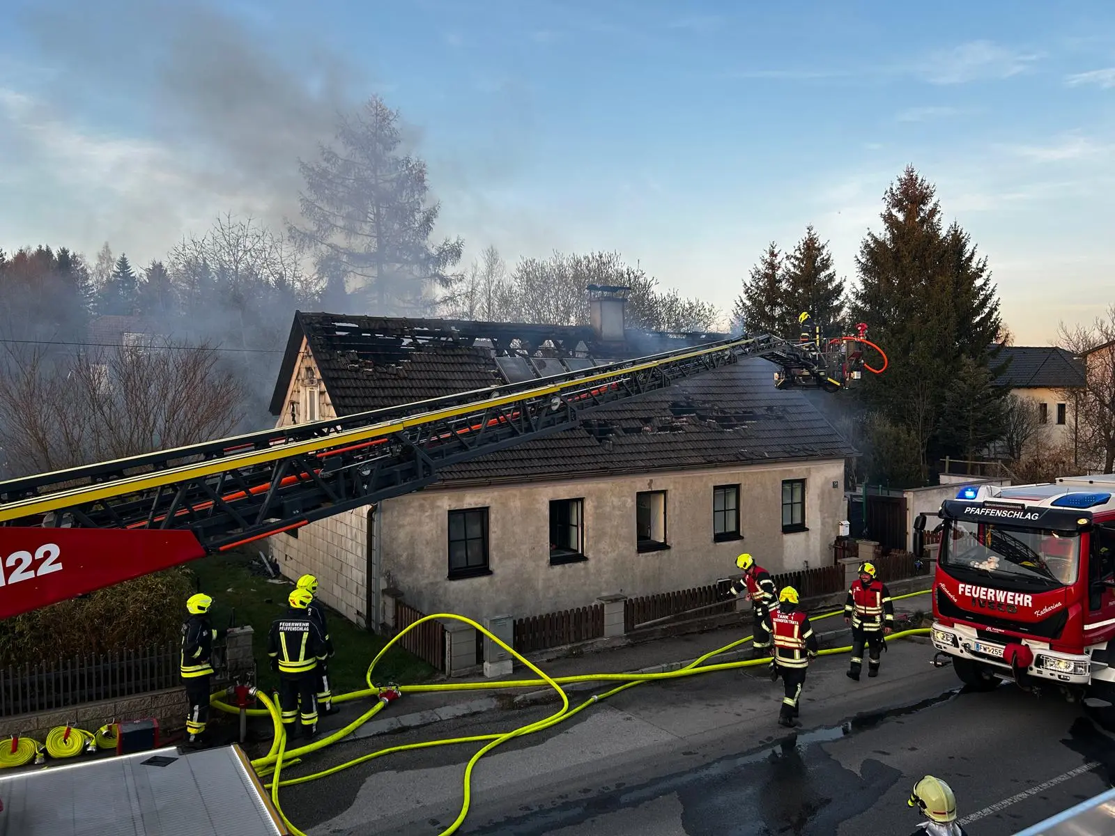 Alarmiert wurden wir zur Unterstützung der FF Pfaffenschlag bei einem Brand in einem Wohnhaus mitten im Ort. Bei unserem Eintreffen stand das Haus bereits in Vollbrand. Die eintreffenden Wehren hatten