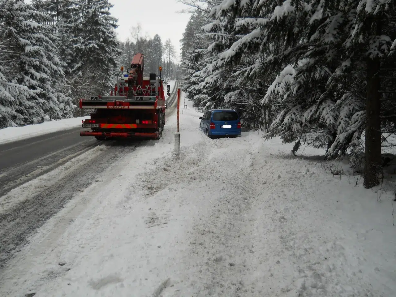 Auf schneeglatter Fahrbahn schlitterte ein Lenker mit seinem PKW zwischen Seyfrieds und Heidenreichstein von der Straße in den angrenzenden Wald. Die 4 Insassen blieben dabei unverletzt. Das Auto wurde mittels