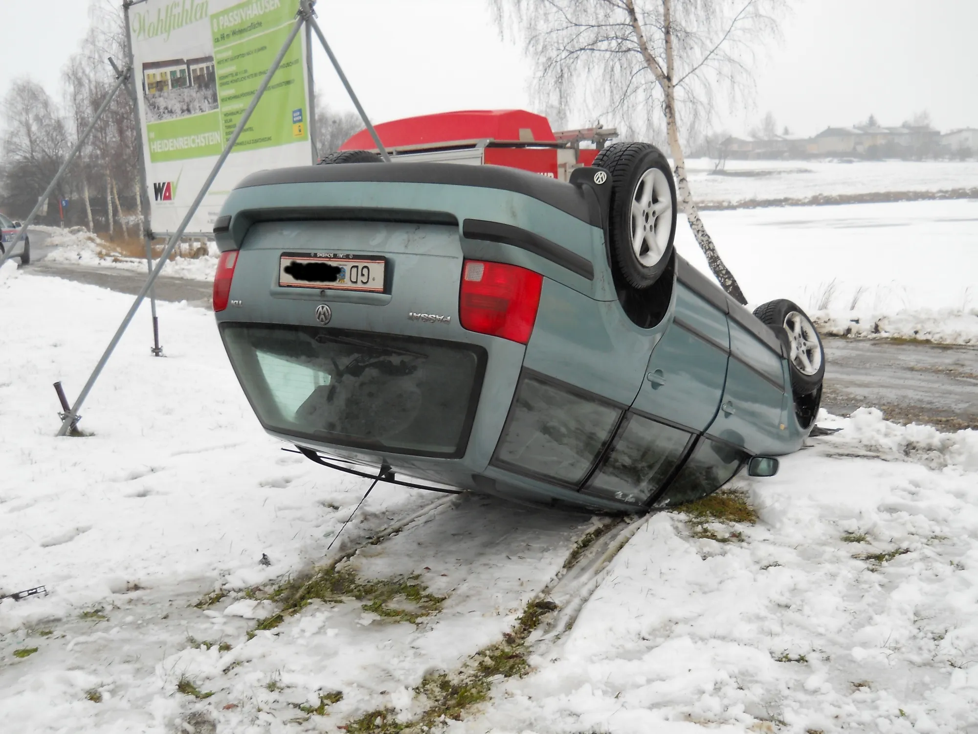 Ein Lenker überfuhr mit seinem VW Passat eine im Kreuzungsbereich befindliche Verkehrsinsel, streifte dabei den auf der VK-Insel befindlichen Stein, was zu einem Überschlag des Fahrzeuges führte. Der Wagen kam