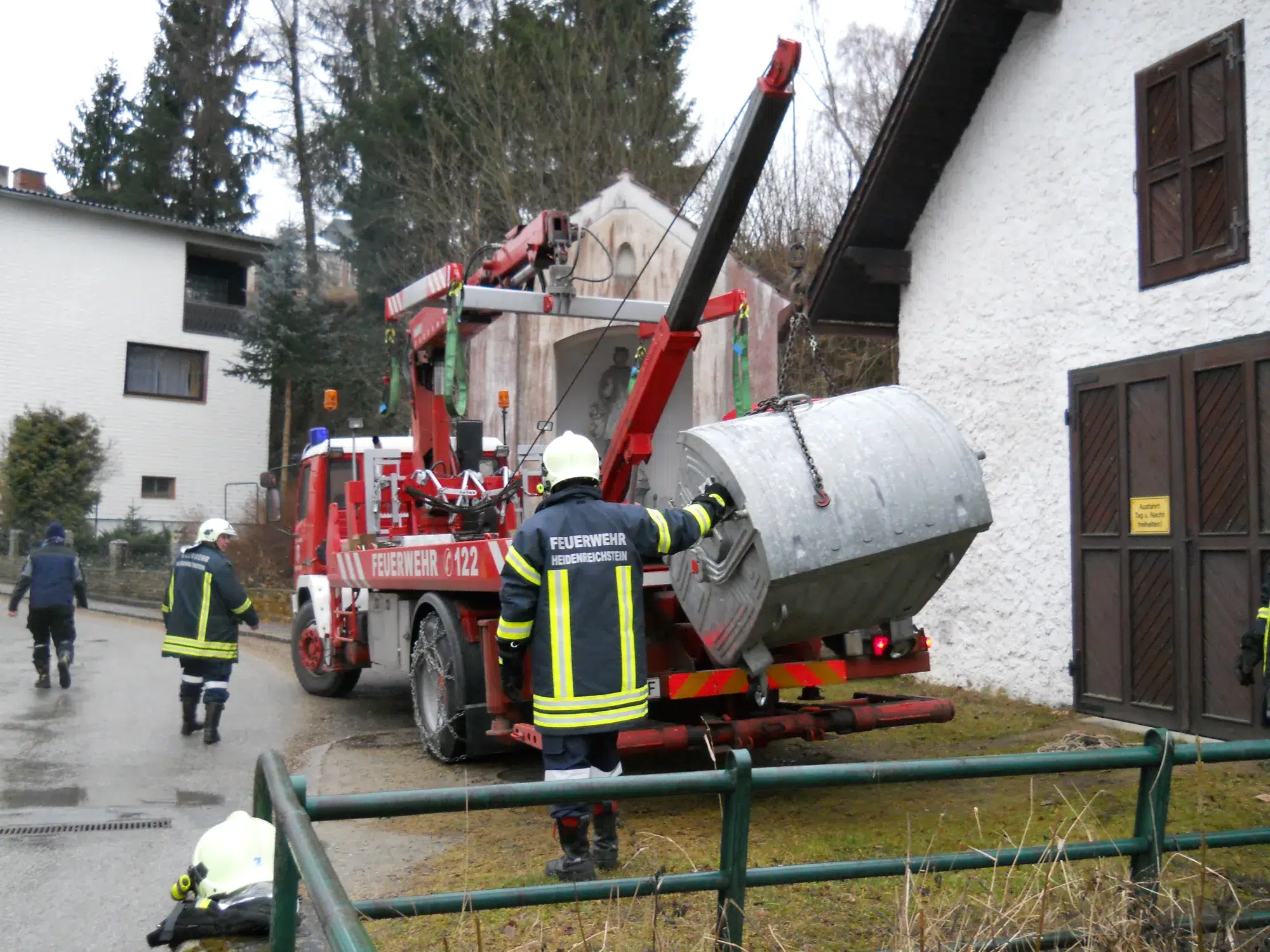 Ein, von Vandalen, in den Romaubach geworfener Müllcontainer musste mit Hilfe des Kranfahrzeuges geborgen werden.