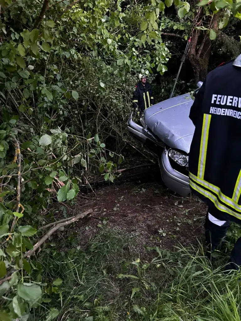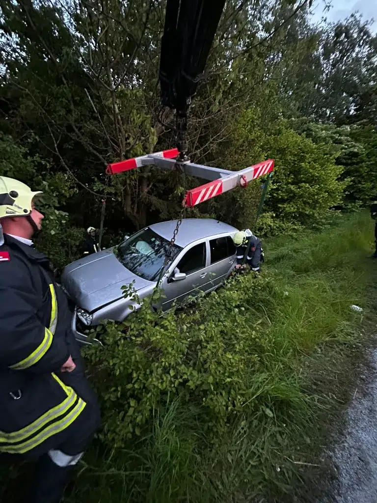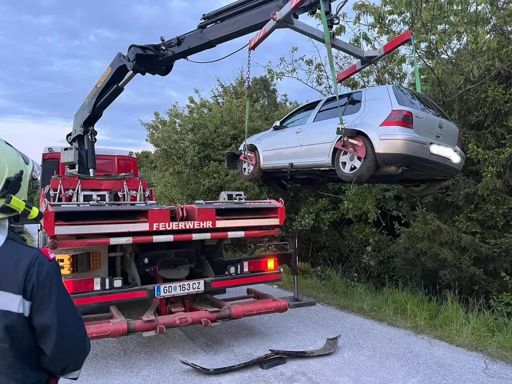 Ein PKW-Lenker kam mit seinem Auto von der Fahrbahn ab und landete im Straßengraben. Der verletzte Insasse wurde vom RK versorgt und ins Spital gebracht. Das beschädigte Fahrzeug wurde mittels Kran geborgen, von der Unfallstelle verbracht und sicher abgestellt.