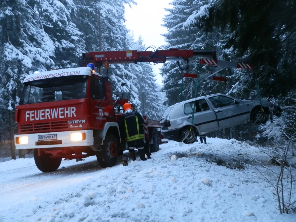 Auf schneeglatter Fahrbahn schlitterte ein Lenker mit seinem PKW zwischen Seyfrieds und Heidenreichstein von der Straße in den angrenzenden Wald. Die 4 Insassen blieben dabei unverletzt. Das Auto wurde mittels Seilwinde geborgen und anschließend mit dem Kranwagen von der Unfallstelle verbracht.