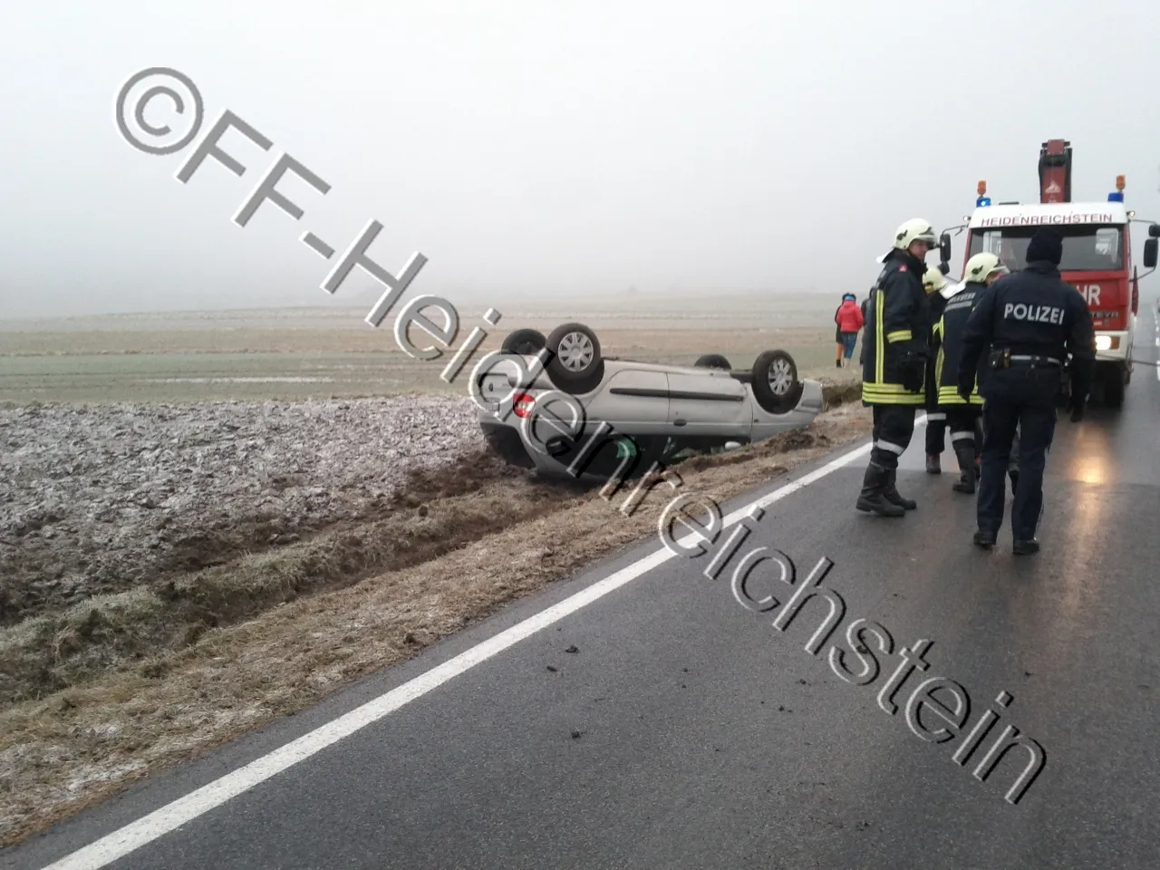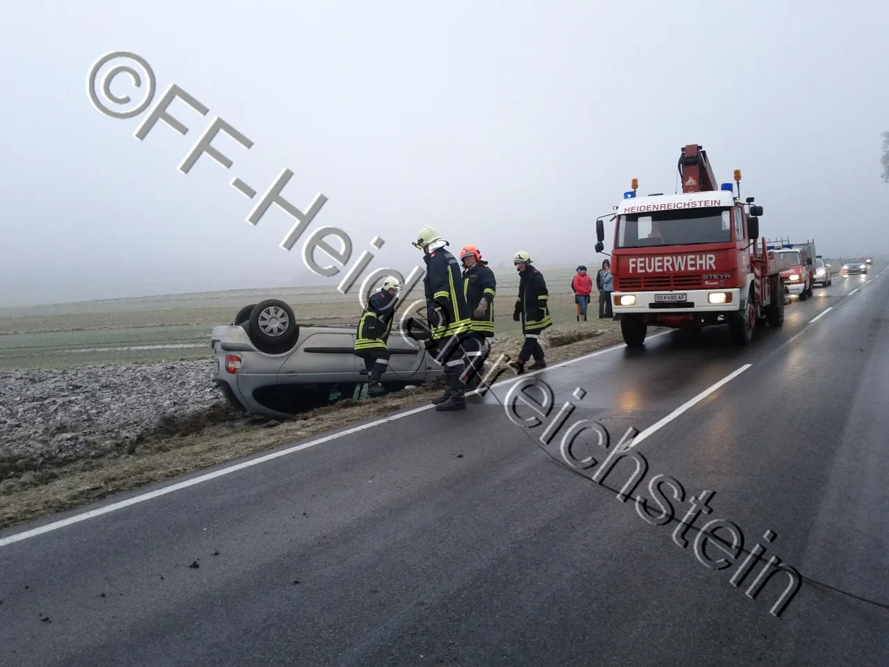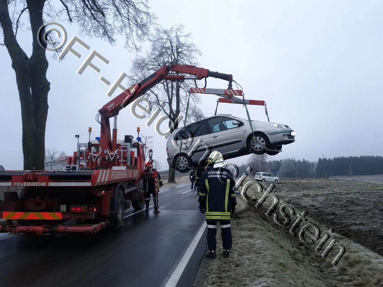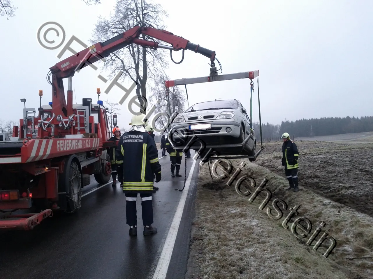 Ein verunfallter PKW, der am Dach zum Liegen kam, musste mittels Seilwinde und Kran aus einem Graben geborgen werden. Nach der Bergung des Fahrzeuges wurde es verladen und verbracht.