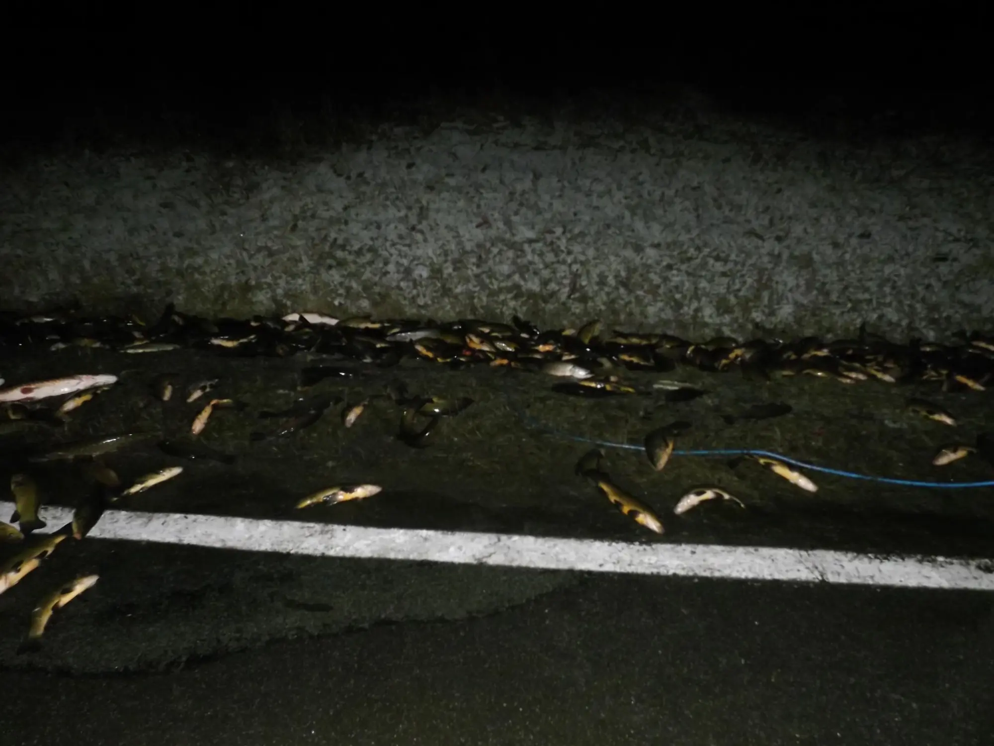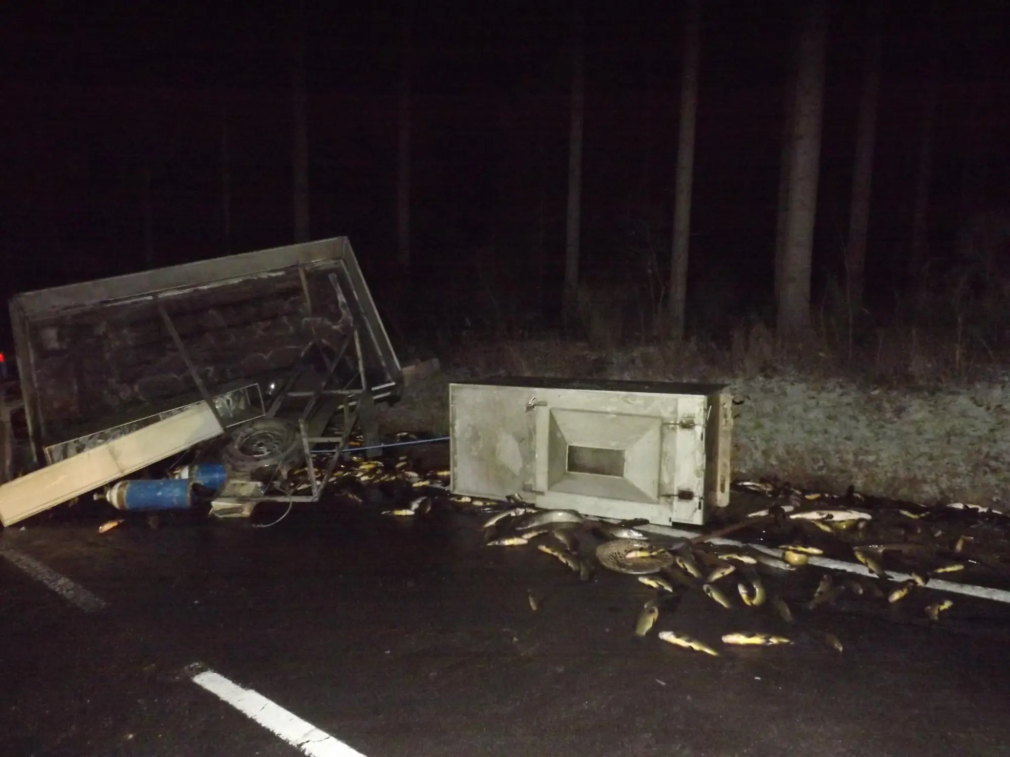 Weiters mussten die auf dem Anhänger transportierten und in Folge des Unfalls über die ganze Straße verteilten Fische eingesammelt werden.