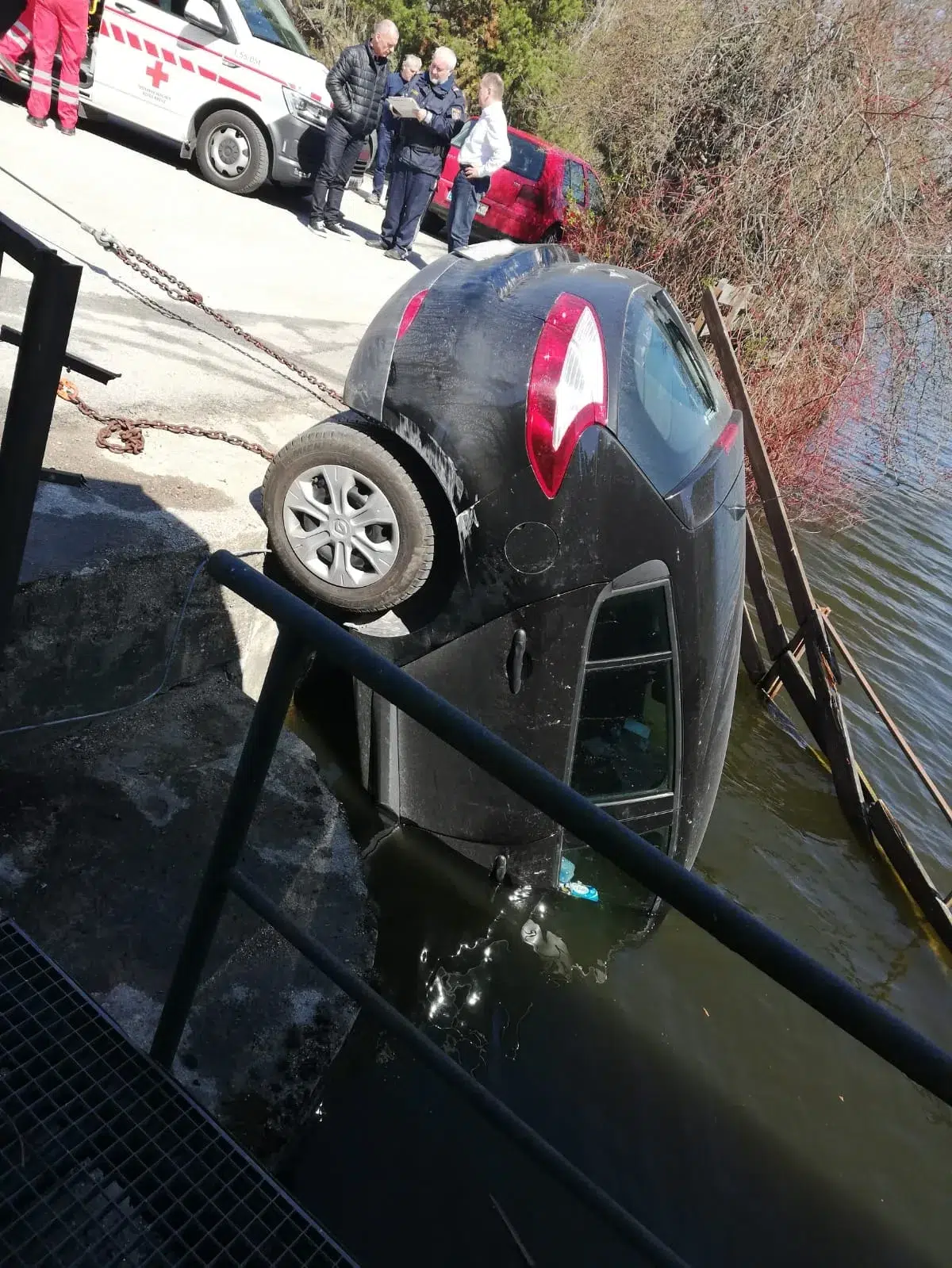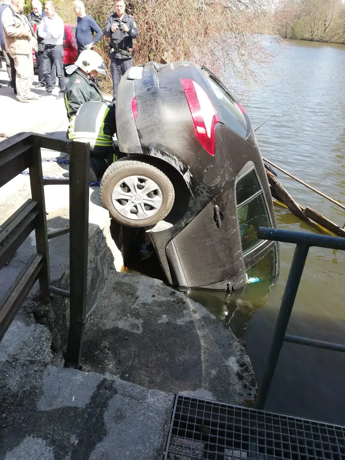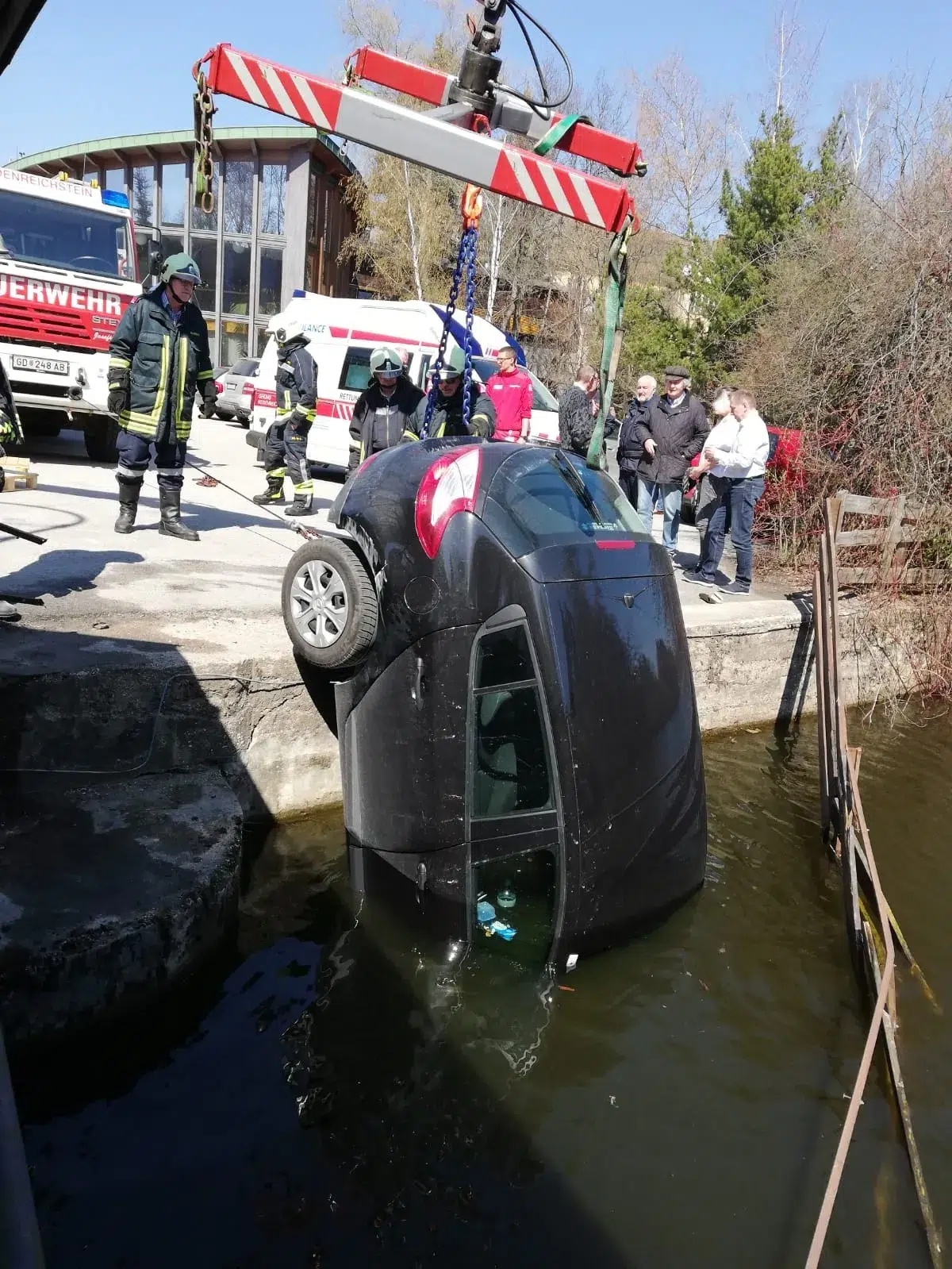 Die anschließende Bergung des Autos mittels Feuerwehrkrans war sehr heikel und spektakulär. Anschließend musste noch ausgeronnenes Öl im Wasser gebunden und entsorgt werden.
