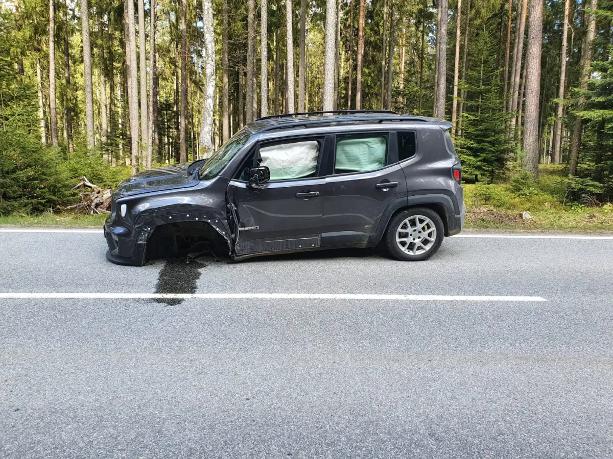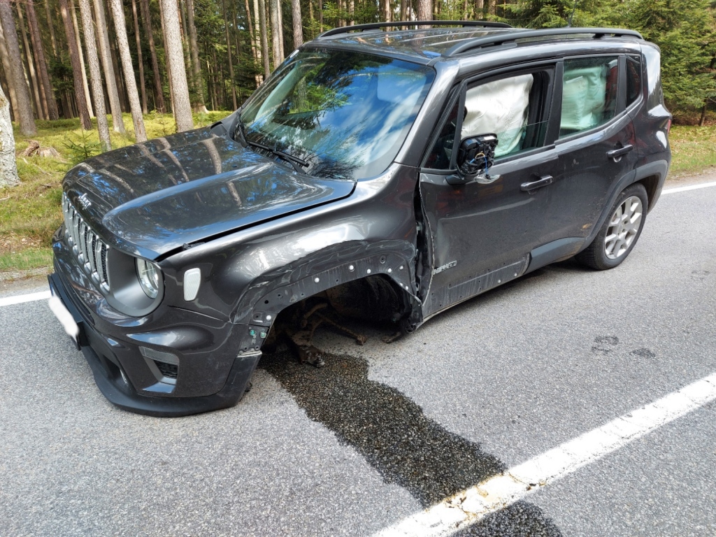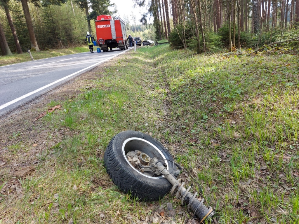 Auch beim Geländewagen wurde dabei das rechte Vorderrad komplett weg gerissen. Trotzdem er nur noch 3 Räder hatte, fuhr der Unfalllenker noch ca. 400 Meter weiter.