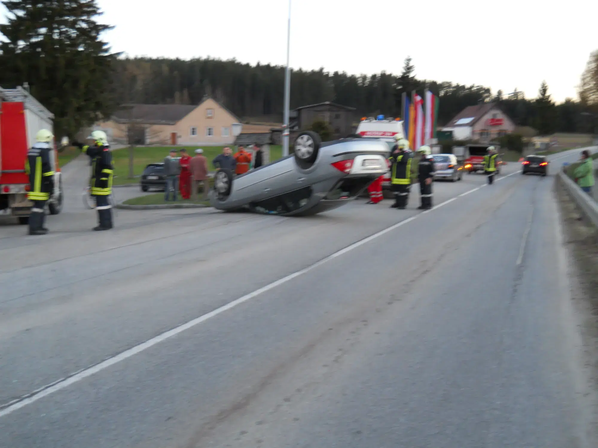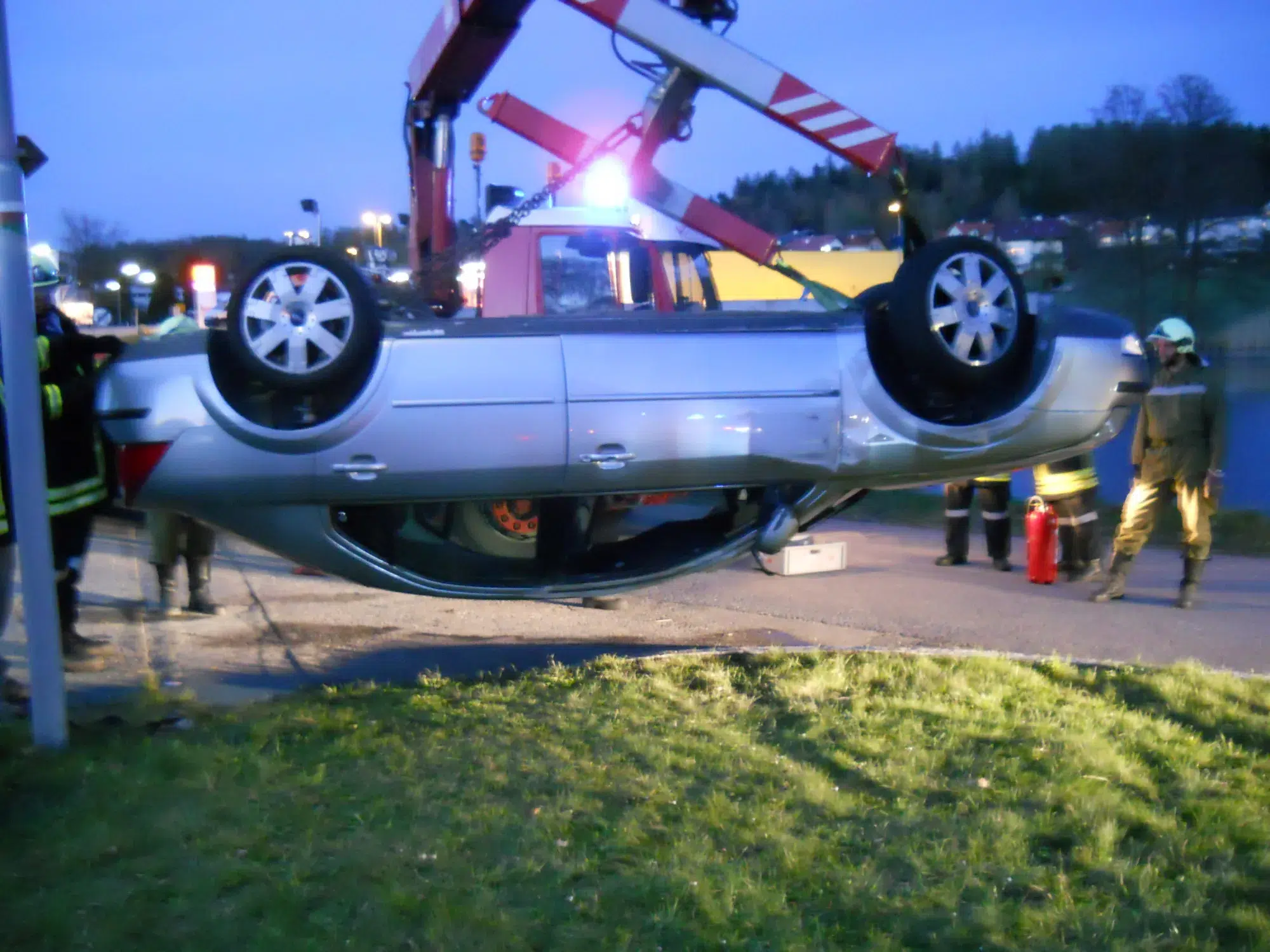 Bergung und Sicherstellung eines PKW, der die Leitschienen touchiert hat und danach am Dach zu liegen kam.