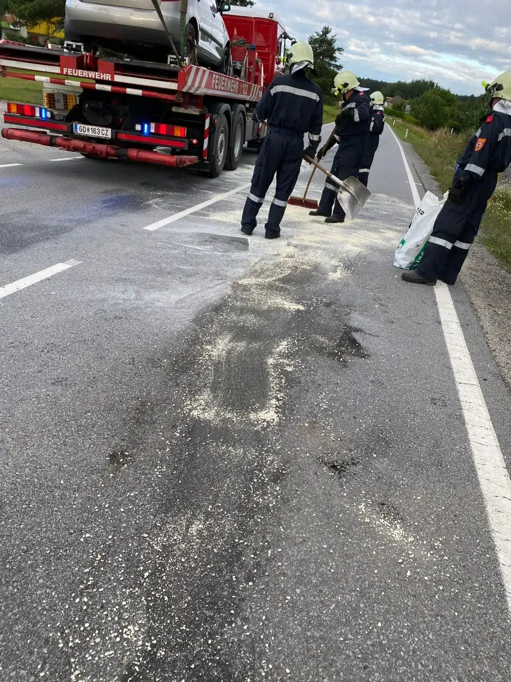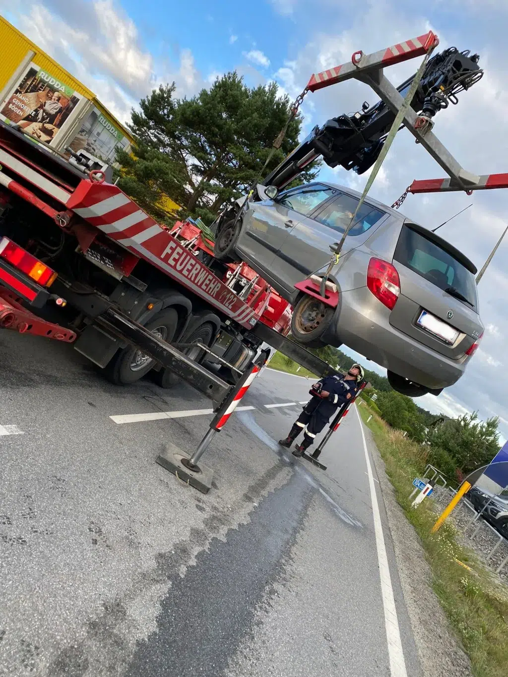 Nach einem Auffahrunfall musste eine Auto mittels Kran geborgen und verbracht werden. Nach dem Binden und Beseitigen der ausgelaufenen Betriebsmittel konnte die Straße wieder frei gegeben werden.
