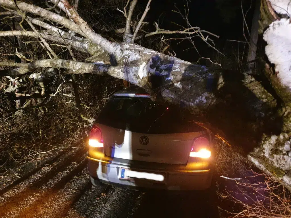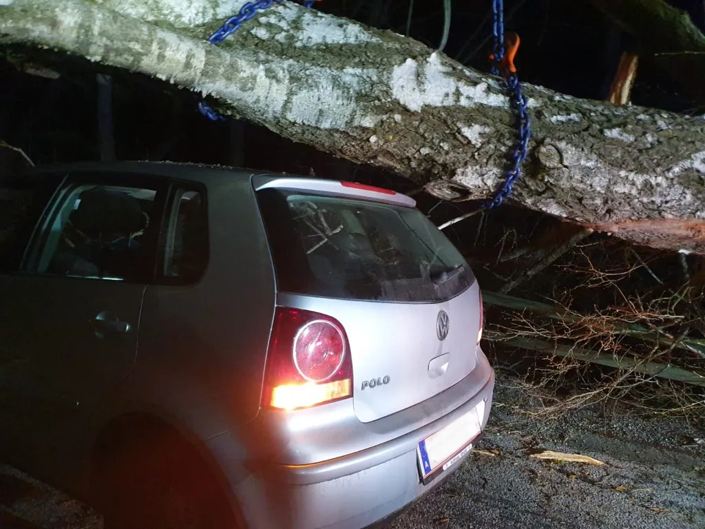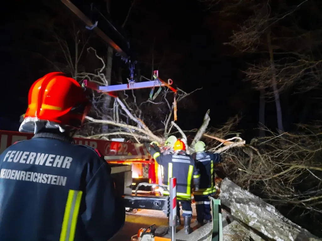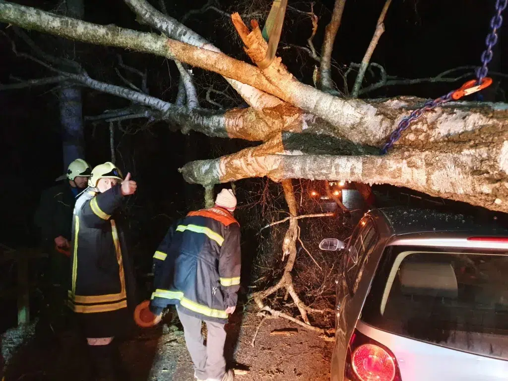 Wir wurden zu einem Einsatz zwischen Haslau und Gutenbrunn alarmiert. Das Einsatzbild lautete „Baum über Straße“. Beim Eintreffen am Einsatzort stellte sich jedoch heraus, dass der Baum nicht nur über die Straße, sondern auch auf einem Auto lag.