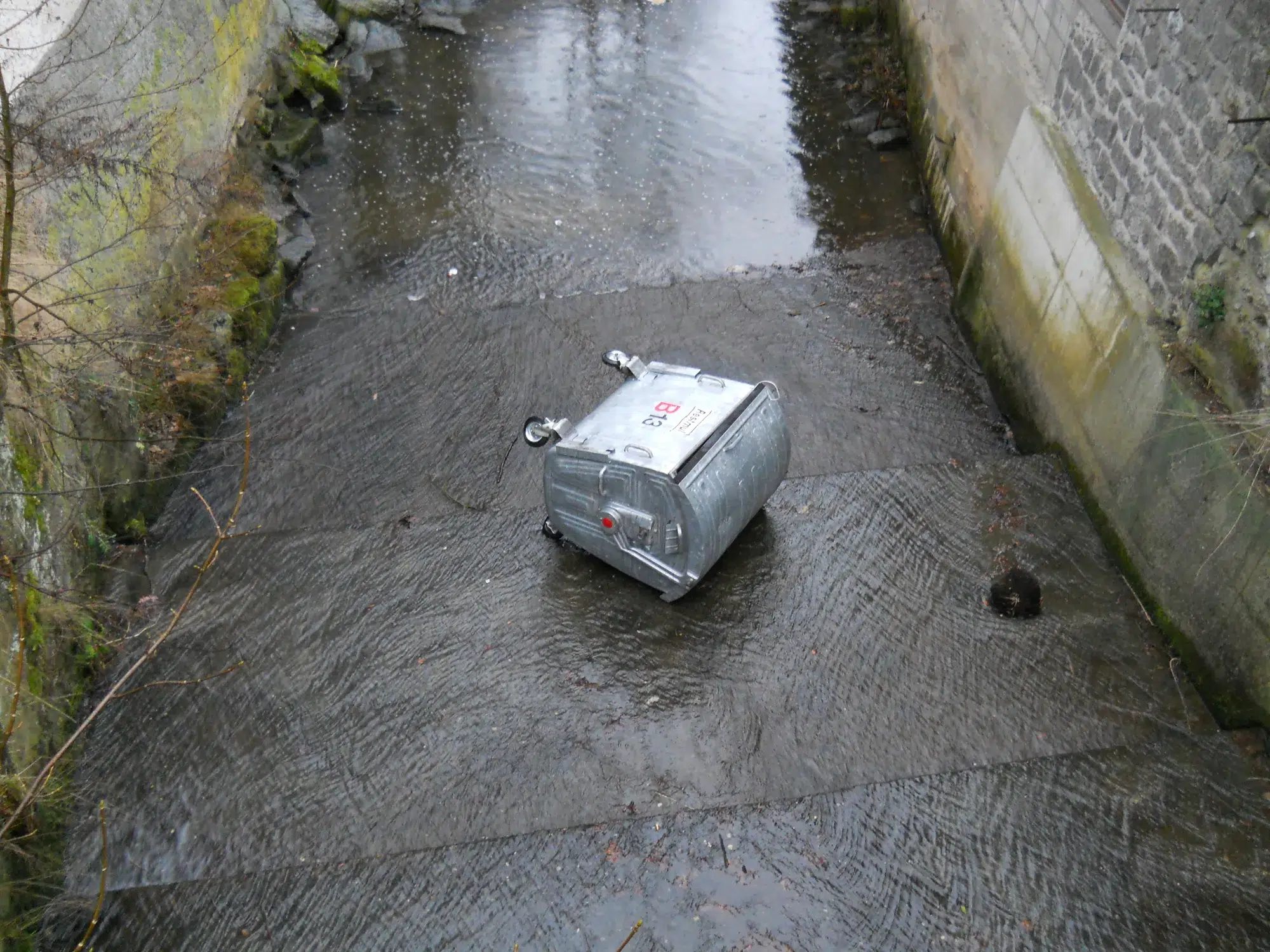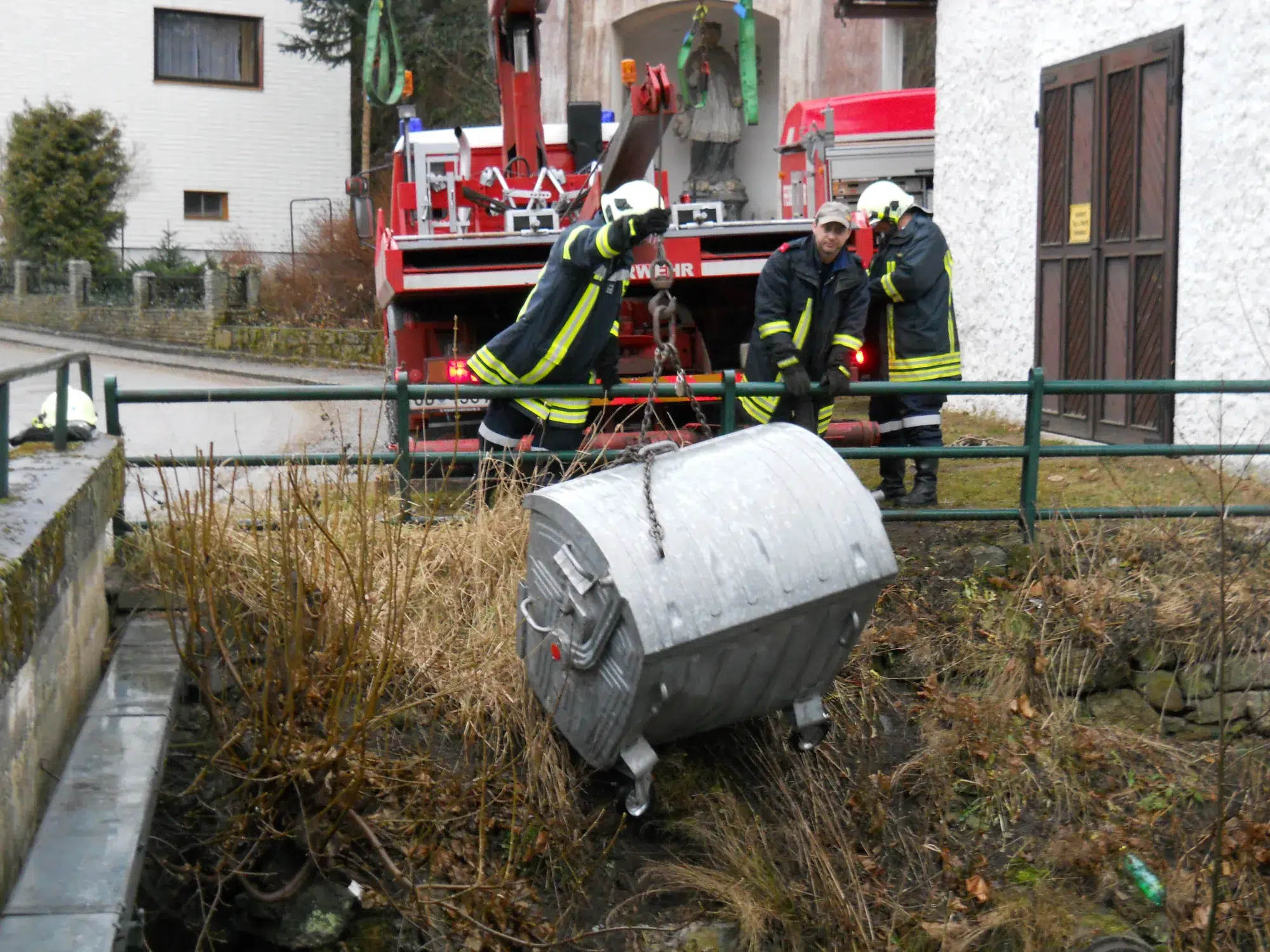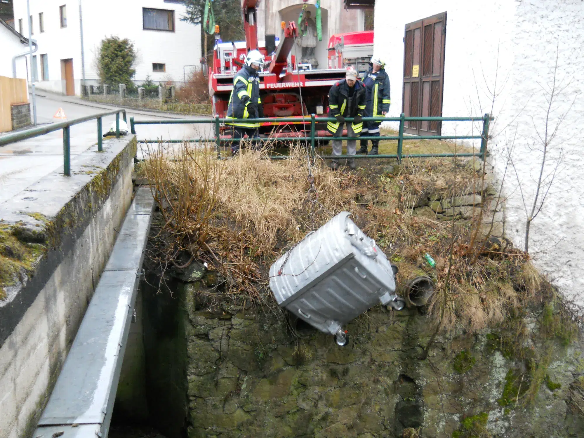 Ein, von Vandalen, in den Romaubach geworfener Müllcontainer musste mit Hilfe des Kranfahrzeuges geborgen werden.
