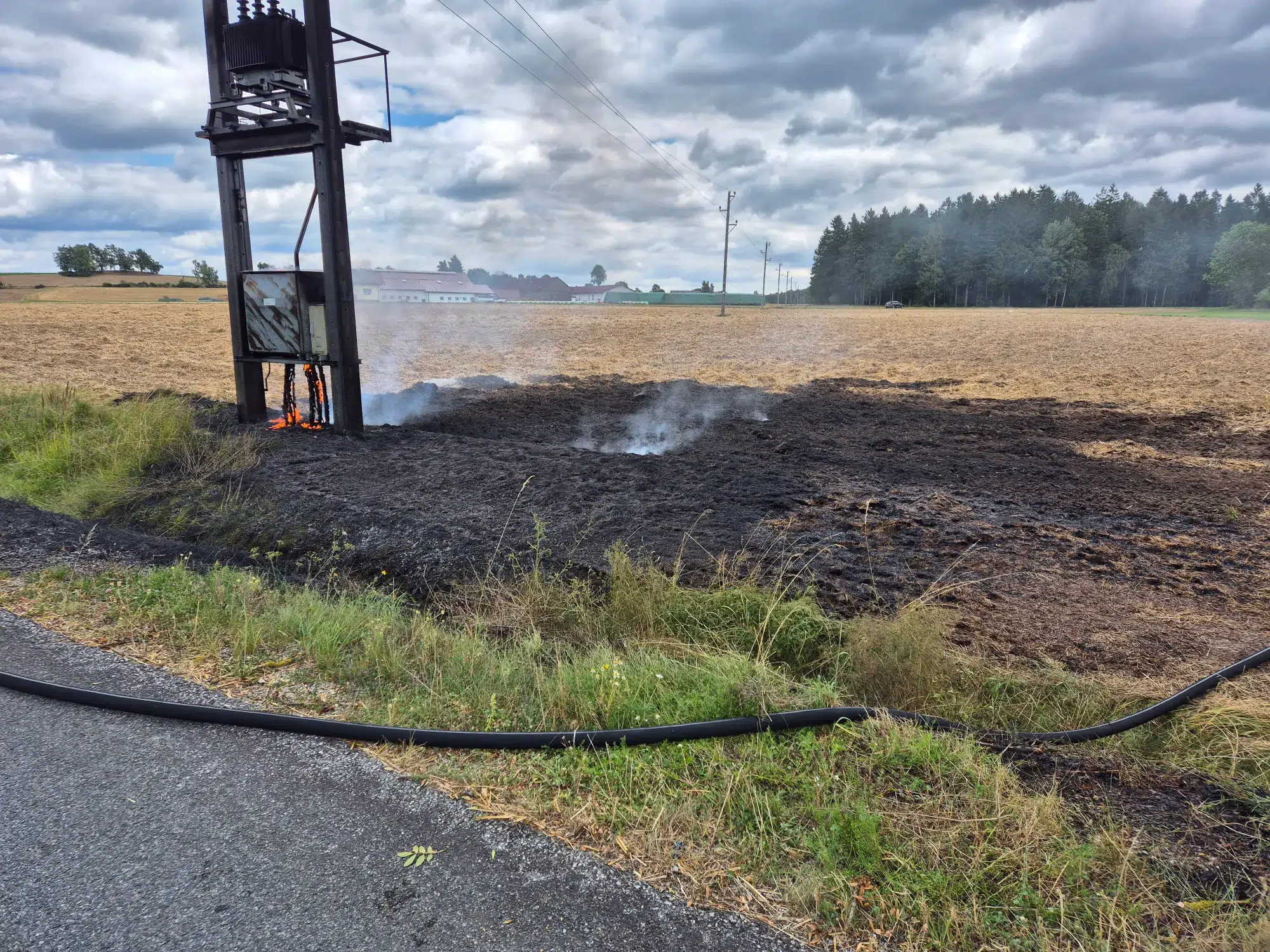 Alarmiert wurden wir zur Unterstützung der FF Eggern bei einem Brand eines Strommastens. Bei unserem Eintreffen stellte sich heraus, dass nicht der Mast sonder der darauf montierte Trafo in Flammen stand. Auch das angrenzende Feld hatte bereits Feuer gefangen.